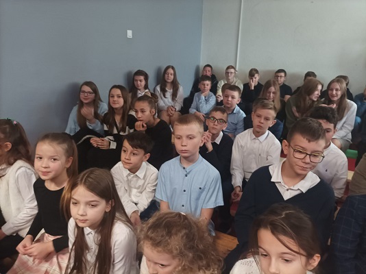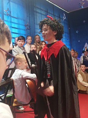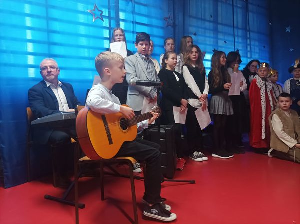 W tym roku przedstawienie bożonarodzeniowe pt. „Niesforna klasa” przygotowali wszyscy uczniowie kl. IV wraz z wychowawczynią p. Ewą K. ,która również zagrała w przedstawieniu .Wybrany scenariusz to nietypowe jasełka, ale scenka z życia szkolnego- walka dobra ze złem, gdzie Boże Narodzenie odmienia całą klasę. Klasie IV w przygotowaniu przedstawienia pomogło wiele osób: ich rodzice i babcie, koledzy z kl.III i nauczyciele. Oprawę muzyczną przygotował p. Przemek G. z Chórkiem Szkolnym, natomiast scenografia to zasługa p. Moniki G. naszej plastyczki, której pomagały mamy czwartaków oraz panie nauczycielki p.Ewa K., p. Dorota Ch., p. Anita H. oraz moja skromna osoba. Na premierowe wystawienie jasełek przybyli rodzice i dziadkowie, którzy nagrodzili występujących gromkimi brawami. Na zakończenie wszyscy wspólnie zaśpiewali kolędę pt. „Wśród nocnej ciszy”. Jolanta Luty.