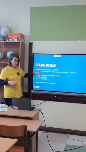 W piątek gościliśmy w szkole przedstawicielkę gminnego wolontariatu, która spotkała się z najstarszymi klasami. Opowiedziała ona uczniom o działalności swojej grupy i przedstawiła nowy program na ten rok, który da szansę na działanie młodym ludziom w nowych obszarach, takich jak edukacja obywatelska czy kulturalna. Mieliśmy także okazję przedyskutować, jak dużo dobrego daje wolontariat. Serdecznie wszystkich zachęcamy do wyboru tej wspanialej drogi! |