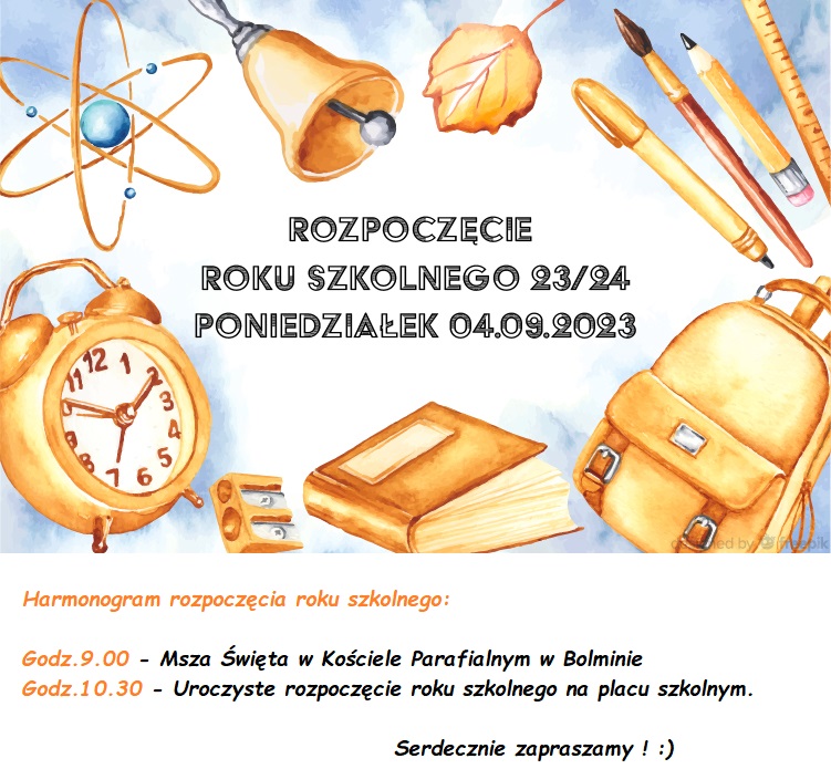 Z ogromną radością zapraszamy Was na uroczystość Rozpoczęcia Roku Szkolnego 2023/2024 w Szkole Podstawowej z Oddziałami Dwujęzycznymi im. Św. Jana Pawła II w Bolminie! Witajcie ponownie! Niech będzie to dla Was Najlepszy Rok Szkolny!